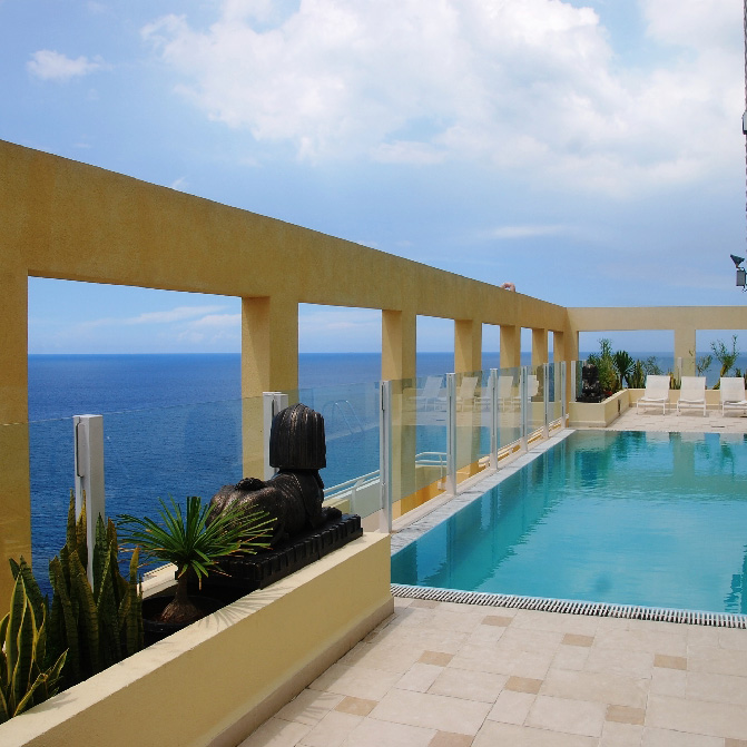 Three-story luxury villa by the sea, with balconies and spacious terrace. Spacious and well-lit bedrooms, panoramic ocean and urban view. Each bedroom has private bathroom. Swimming pool and terrace on the third floor. Original design and modern bathroom fittings. Jacuzzi in the main bedroom.